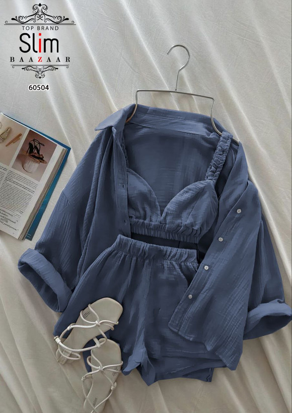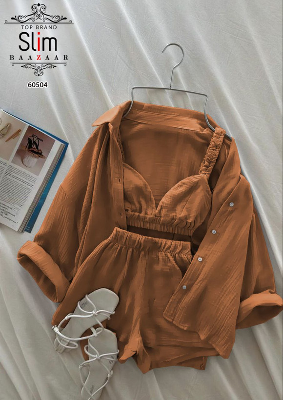 ست سه تیکه شومیز و شورتک و کراپ لینن شانتون وارداتی تنخور عالی